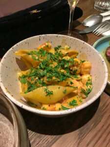 Pictured here are the fried chicken with butter chicken sauce (“by far the best dish of the night”), the slightly more incongruous langoustine dumplings, the spaghetti hoops (a work in progress) and the peach and mango cobbler