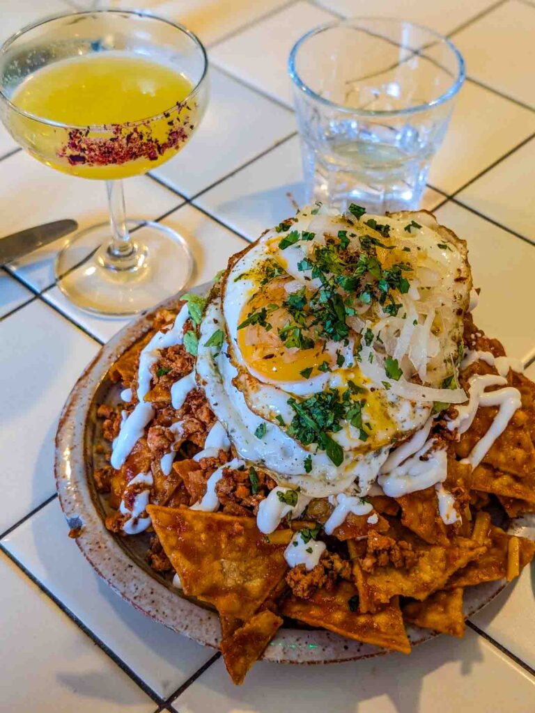 Then, a plate of chilaquiles rojos (‘cheel-ah-keel-ehs ro-hos’) hit the counter. Crispy totopos drenched in salsa roja (a recurring theme) were topped with two fried eggs, Mexican-style chorizo, guacamole, cheese, crema, onions and coriander. This wasn’t a plate, it was a mountain. From where could I take a totopo without an avalanche of spicy delight falling off the plate? It was a game of Mexican brunch Jenga, and to make it more difficult, I popped an egg yolk and it ran down the totopos like bright-yellow lava. Dan saw my struggle and handed me a second plate.