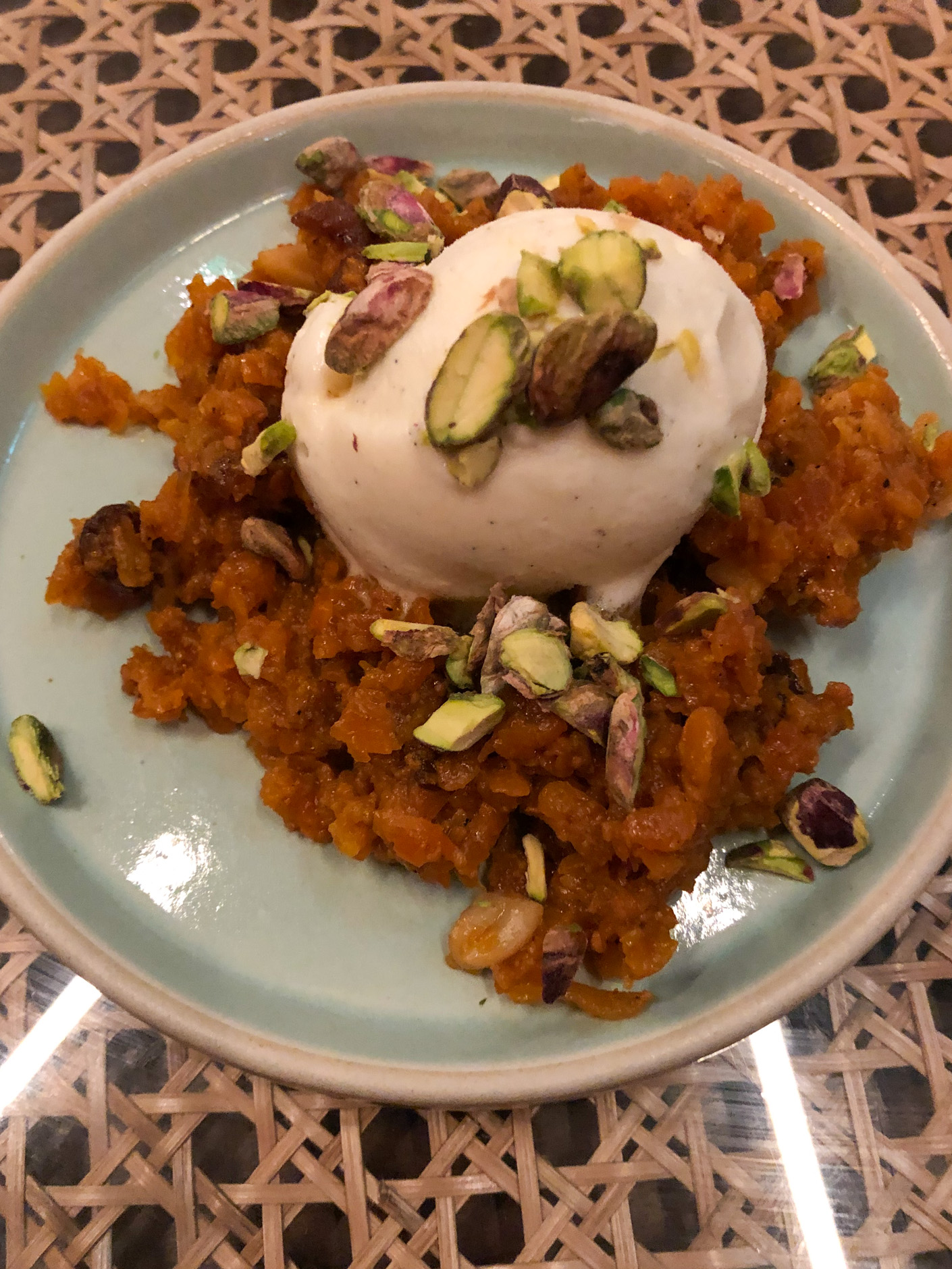 Pictured here are the fried chicken with butter chicken sauce (“by far the best dish of the night”), the slightly more incongruous langoustine dumplings, the spaghetti hoops (a work in progress) and the peach and mango cobbler