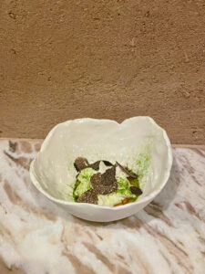 Apricots, whipped custard and matcha, topped with shaved black truffle