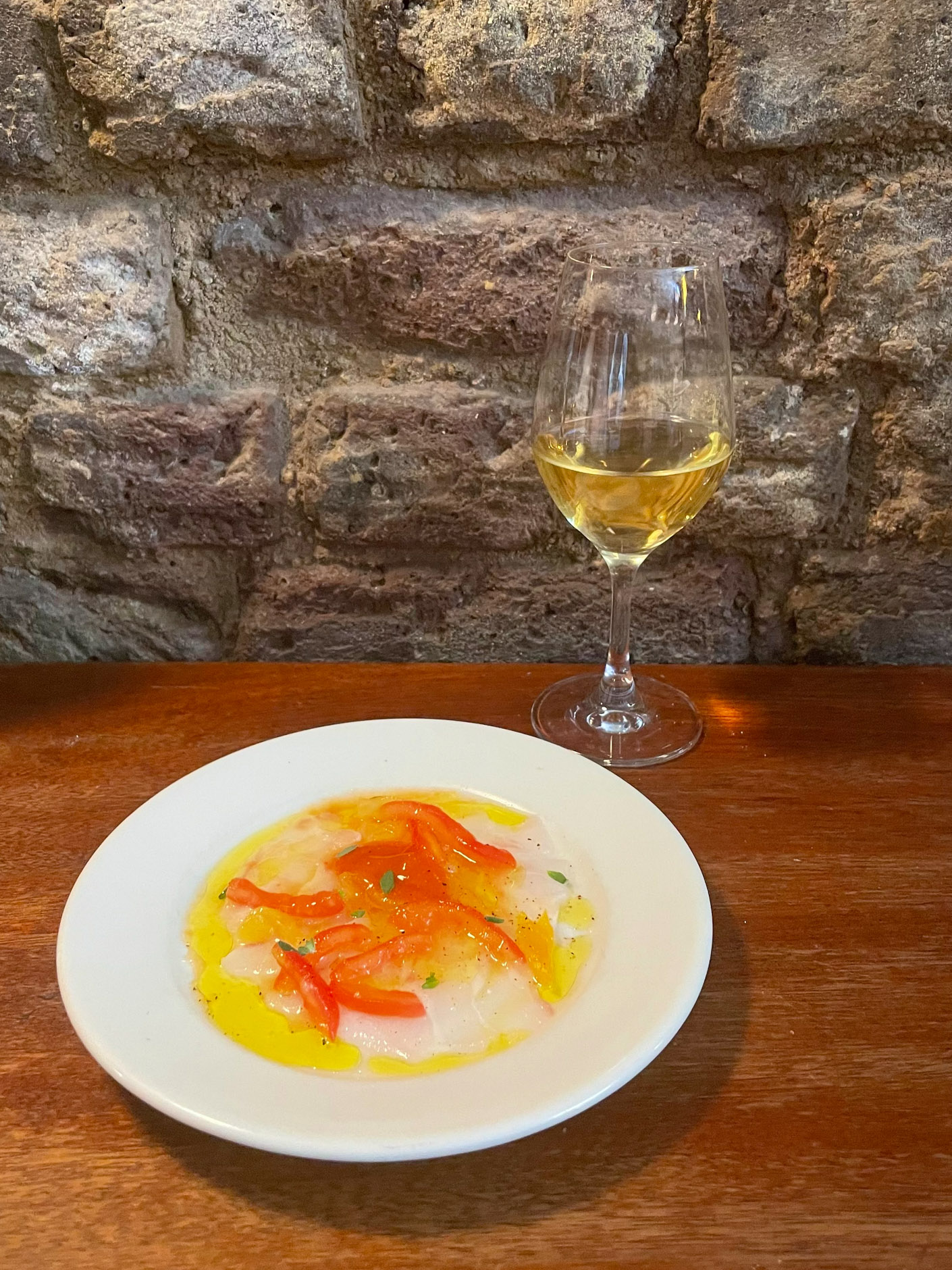 Raw sea bass, fresh tomato, marjoram and olive oil