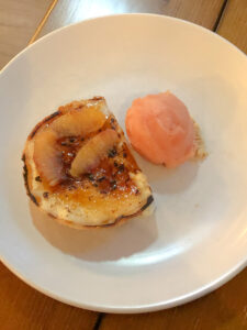 Pictured here are the fried chicken with butter chicken sauce (“by far the best dish of the night”), the slightly more incongruous langoustine dumplings, the spaghetti hoops (a work in progress) and the peach and mango cobbler