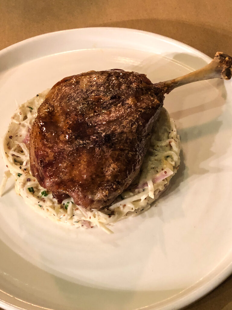 Then that confit duck (£15). You really have to admire the chops of any kitchen that just presents a bird leg on a disc of celeriac and chicory remoulade. With nowhere to hide, and no sauce to mask any embarrassment, it’s all about the cookery. It was another study in less-is-more and another triumph: the skin crispy, the meat tender thanks to the slow-cooking in its own fat, and the remoulade providing a vegetal counterpoint – creamy and with just the right amount of mustardy swagger.