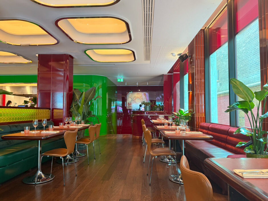 Town feels expensive and stylish, with an interior design style I will call retro-futuristic luxury; the kind of place that would have prompted Lady Penelope to ask Parker to fetch the Rolls. Vintage car art, 70s-vibe glossy burgundy and green colour scheme, extraordinarily comfortable chairs and deep leather banquettes, and rounded corners everywhere: tabletops, chair backs, light fixtures, columns, everything is curved and softened.