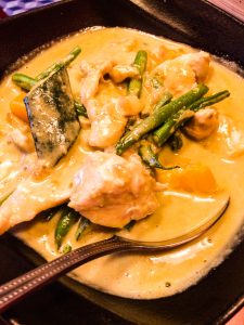 Pictured here are the fried chicken with butter chicken sauce (“by far the best dish of the night”), the slightly more incongruous langoustine dumplings, the spaghetti hoops (a work in progress) and the peach and mango cobbler